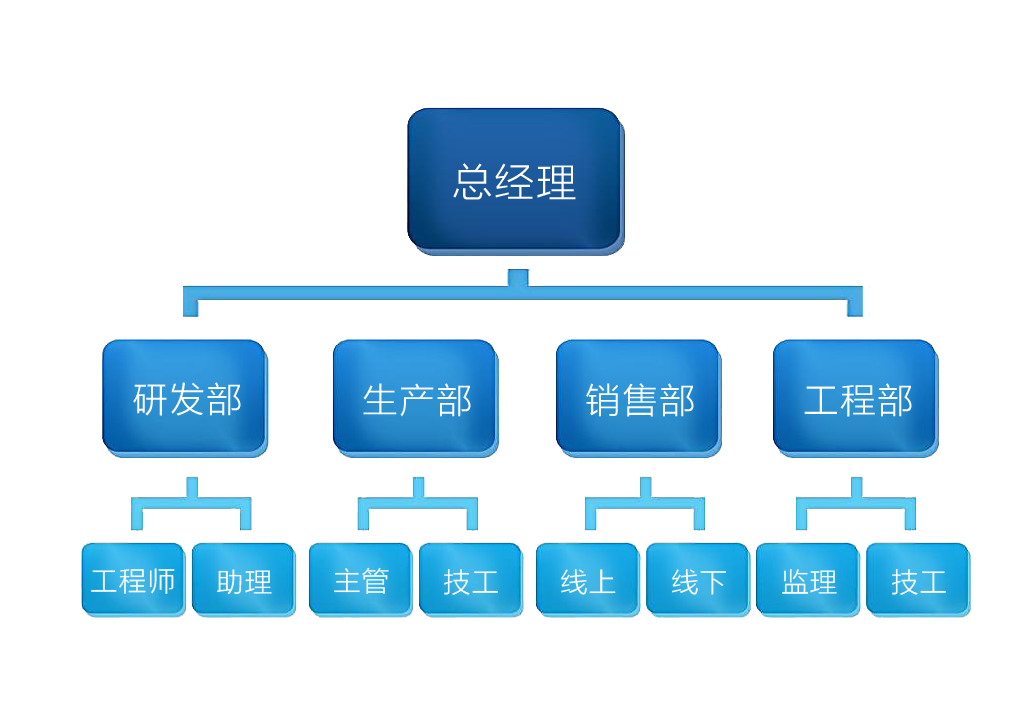 公司主要分為四大部門:研發(fā)部、生產部、銷售部和工程部。最高權利機構:總經理主要負責公司的經營決策、公司制度的審批以及人員聘用等方面的重大決策。以下是公司組織結構圖。