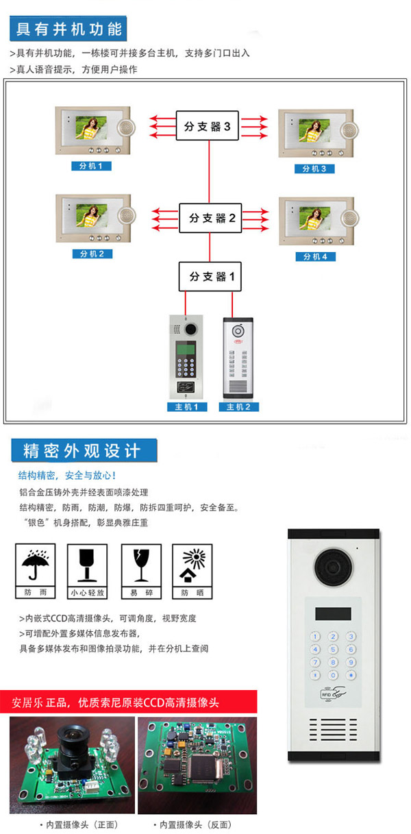 內(nèi)置CCD高清攝像頭,可設(shè)置密碼開鎖,上電與斷電兩種開鎖方式可選,鑲門或嵌墻安裝