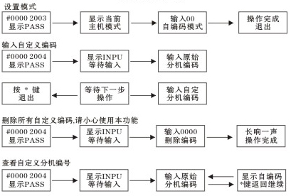 4. 特殊分機房號編碼:在主機按“0000+2004+ 分機原始房號+自定義特殊房號”設(shè)置完第一個房號后,主機顯示"INPU”后,進入下一個分機房號編碼。輸入“分機原始房號-自定特殊房號”依次設(shè)置即可. 設(shè)置完成后在主機“中” 鍵退出,設(shè)置完成