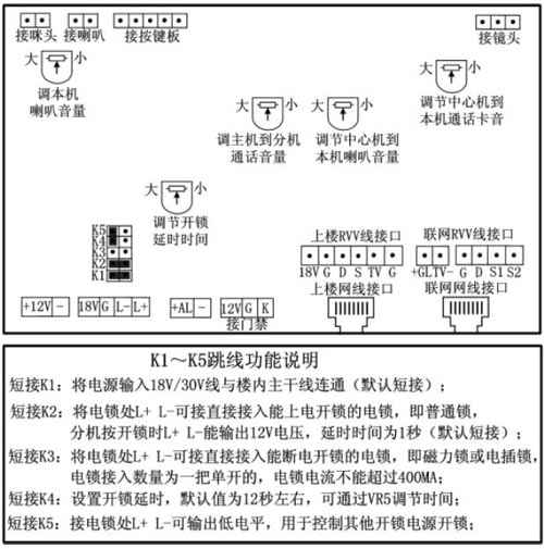 注:主機默認是接電控鎖,如果是接磁力鎖,須把K2插帽拔掉,然后短接K3 和K4插帽,這樣是通過調節(jié)VR5來設置開鎖時間,也可以只短接K3,然后通過在主機上輸入#00002002+XX來設置開鎖時間。